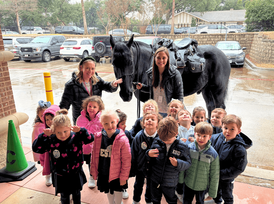 To bring this lesson to life, they welcomed several special guests from both the ESD and greater Dallas communities. Students met real firefighters, police officers, security officers, a dentist, and a nurse who shared about their important roles and daily responsibilities. Our Talon Security team invited students to learn more about how campus safety is maintained, while officers from the Dallas Police Department visited campus with live police horses! Firefighters also provided an up-close look at their fire truck and equipment, including an exciting fire hose demonstration that gave students a firsthand view of how they respond in emergencies.