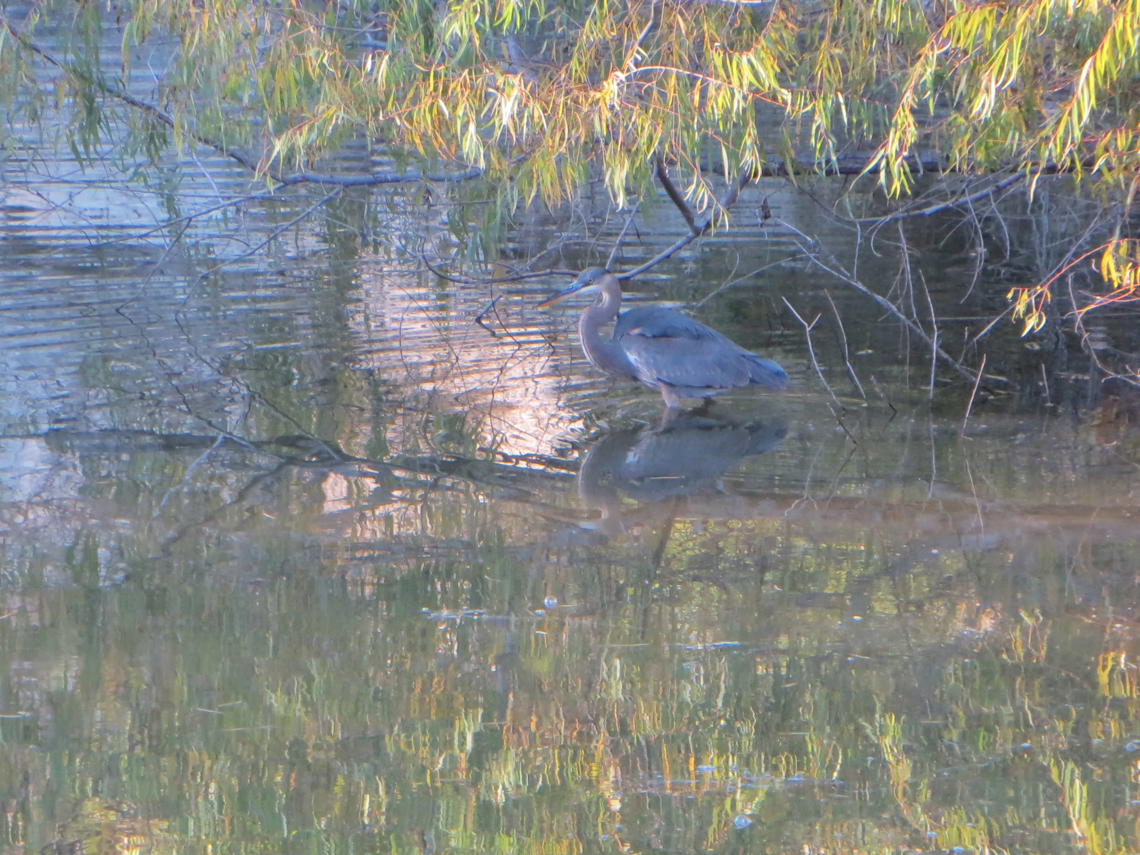 Migrating ducks and hawks are all over the place. The photo is of a Great Blue Heron hunting in fall leaves.